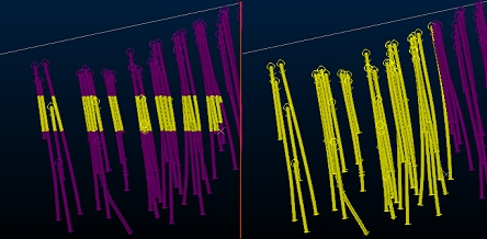For example, in the image below, box selection has been applied using the Select drillhole samples option (left) and the Select entire drillhole option (right). The selection scope is identical for both images: