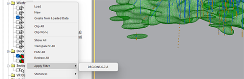 Filtering can be applied to show only data that matches certain conditions, such as specific attribute values, and filtering can also be restricted only to particular loaded data objects. For example, you may want to filter to show lithology values of loaded drillholes, whilst drawing the entirety of a loaded block model that comprises the same values.