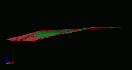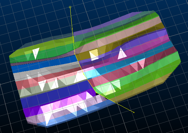 For example, say your output wireframe volume is split using a boundary string. To ensure the 'cutout' is split into horizontal benches of 10m height, the Distance between planes is 10 and a vertical additional cutting plane is used:
