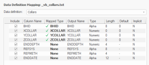 You can map fields however you like, and to make it easier to set up required fields for a given data type, you can pick a Data definition in advance. The Data Definition Mapping table then highlights those fields that are required for Studio to recognise the selected data type. For example if you select the Collars definition, the fields XCOLLAR, YCOLLAR and ZCOLLAR must be mapped before you can import the file.