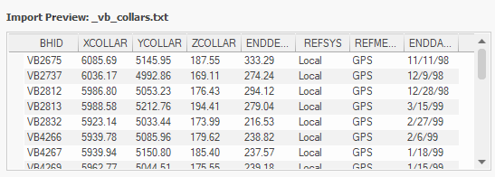 Once an import file is specified, Text Importer attempts to map the data attributes of that file to known system attribute names in Studio. For example, a borehole ID attribute, if it matches an array of known aliases, is matched to the BHID column in a collars file.