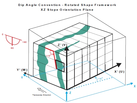 For rotated stope-shape frameworks the strike and dip parameters are measured in the local co-ordinate system