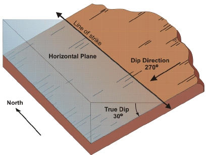 Angles for dip and strike are specified as true dip (TRDIP), and true dip direction (TRDIPDIR) respectively. TRDIPDIR ranges [0..360] and TRDIP normally ranges [0..90] in geological applications. TRDIPDIR is found by adding 90 degrees to the bearing of the TRDIP direction.