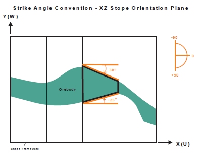 The Strike angle conventions are the same for the various Slice frameworks (i.e. XZ | YZ | XY | YX). Strike is measured positive clockwise from the primary strike-axis (U-axis positive direction) of the selected stope-framework orientation/plane: