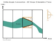 The angle conventions are the same for the Vertical XZ|YZ methods and the Section XZ|YZ methods. Strike is measured clockwise from the primary stope shape framework axis (the long section view), looking along the axis in the positive coordinate direction. Dip is measured from the horizontal left axis looking along the primary axis.