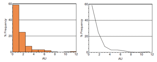 Incremental and Cumulative Histogram types can be shown in any of the formats above. Here's an example of a simple one-variable frequency chart for AU in both bin and line formats: