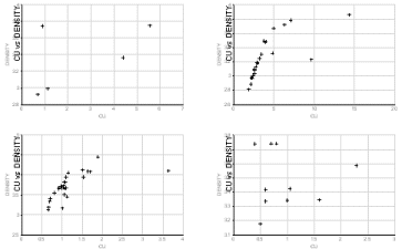 The Scatter Plot dialog offers the choice of creating multiple individual charts (representing multiple data subsets) or a single, compound chart showing all results in one view. A compound chart will, by definition, always be a single 'page', however, multiple charts are handled by a single chart 'object' in memory using independently accessible pages. For example, if the Multiple Charts option is selected in the Scatter Plot dialog, and the X Axis, Y Axis and Key fields that have been selected give rise to multiple charts (for example, X and Y axes represent CU grade vs. Density, and a selected NLITH key field - which in itself contains 4 distinct values - gives rise to four variants of this chart), those charts are listed independently in the Charts tab: