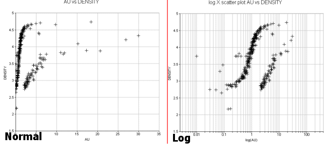 A wide variety of chart formatting options are available; charts can be created based on a combination of axis fields. Key fields can be used to display data divided into key categories. You also choose from either normal or logarithmic distribution options independently for each axis, e.g. the following images show a standard scatterplot to show the relationship between grade x density on the left, and a log plot equivalent on the right: