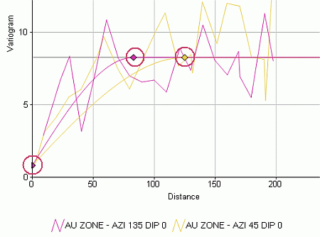 Lock Sill Value: select this to fix the upper sill of the model at its current level. Moving the control point for the highest structure will then only change the range. Moving control points for other structures (if any) will change the spatial variances (Ci values).