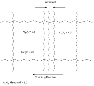 MATERIAL is a field in the input model file. If the zone of a slice is C and the value of MATERIAL in the slice is LGS, and the grade of FE is less than 50, then redefine the zone as X. If the zone is D and the grade of AL2O3 exceeds 3, then shrinking will be attempted, irrespective of the value of MATERIAL.