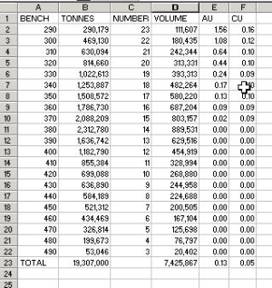 The results are automatically broken down by bench, taken from the block model cell height. An overall total evaluation is also determined and optionally the results can be reported by KEY field. The BENCH number reported refers to the 'base' of each bench.