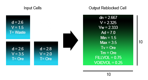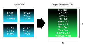 The new cells sizes can be any size and do not have to be an integer multiple of the input model parent cell size. Care should be taken if re-blocking to a smaller cells size because very large models can be specified. An error message is displayed if the selected cell sizes would cause the output model to exceed the system limits .