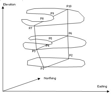 For example, Figure 1 shows a set on input perimeters representing the plan outline of a particular rock type on 4 benches. These perimeters are intersected by 2 north-south planes. The output intersections file contains 7 fields - the X, Y and Z co-ordinates of the 2 end points (X1, Y1, Z1 and X2, Y2, Z2) and a perimeter value field containing the PVALUE of the original perimeter. In the example of Figure 1 the file will contain 7 records, one for each of the intersection lines P1P2, P3P4, .... P13P14. The X1 and X2 values are northings, Y1 and Y2 the elevations, and Z1 and Z2 the easting of the intersection plane. The PVALUE for intersection line P1P2 is 10.