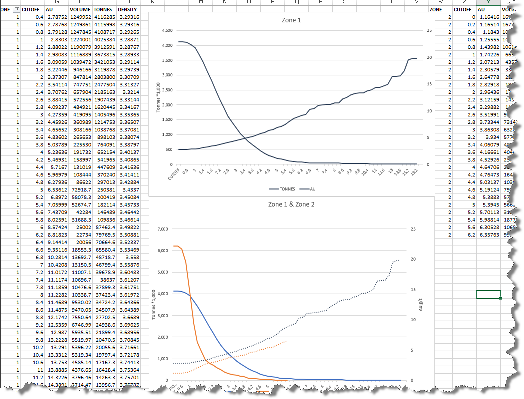 If @EXCEL is set to 1 then and the cumulative output data file (TGCUMTIV) has been created then the results will automatically be loaded into EXCEL (if version 2016 or higher is installed) and a chart of tonnes and grade against cutoff will be displayed. However note that EXCEL will not be run if any of the COLUMN, ROW or BENCH options have been selected.