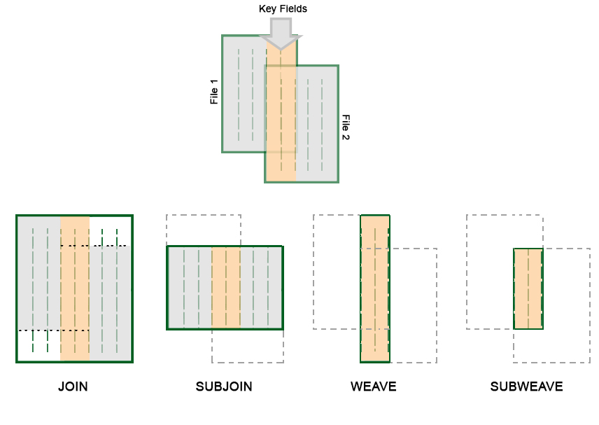 This process belongs to a group of four similar ones within the Datamine process collection; JOIN, SUBJOI, WEAVE and SUBWVE. Each provides a different outcome, as described by the following diagram:
