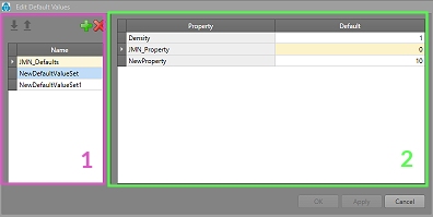 - Default Values List – Previously defined default value sets. Add new sets with + and delete existing ones with X.