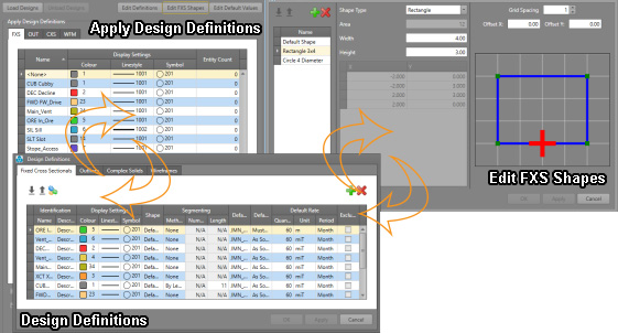 Fixed Cross Sectional (FXS) design types represent underground excavations of a fixed cross sectional shape and dimensions and are set by the length of a design string. Any closed shape may be used as the cross-section. The design string acts as a survey line that can be located at any point within the development cross-sectional shape.