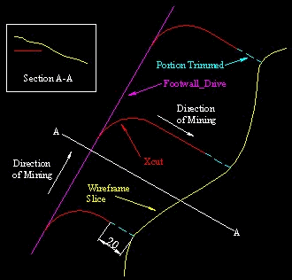 A good example of using this action is the case of a X-cut which runs from a Footwall Drive and stops 20m short of intersecting the reef. The Xcut would initially have been trimmed to the reef wireframe, thus it would continue all the way to the reef wireframe.