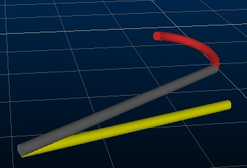 After processing, the design data is appended with a new string segment (in this example it was connected to a DECLINE design definition and is shown in red). Perspective 3D formatting has been added to highlight the orientation of the new string segment and a yellow segment is added to show the ground plane: