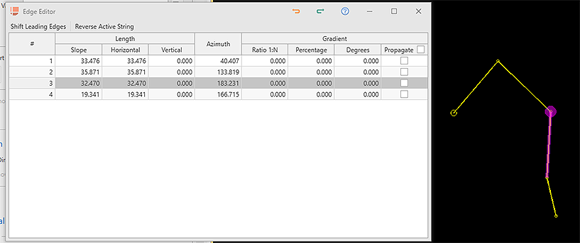 By default, edge properties are calculated from the start to the end of the edge. You can change this using the Reverse Active String toggle at the bottom of table. This will automatically update the values in the table to reflect the new direction of measurement.