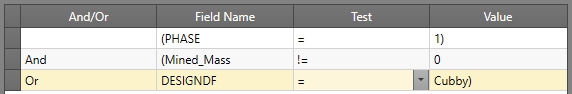 The Edit Filters screen supports the usage of brackets to control the filter expression. Opening brackets are inserted as part of the Field Name description and closing brackets are added to the end of the Value. For example, the following setup will ensure a filter passes if the PHASE is 1 and either the Mined_Mass is non-zero or the DESIGNDF (design definition name) is "Cubby"):