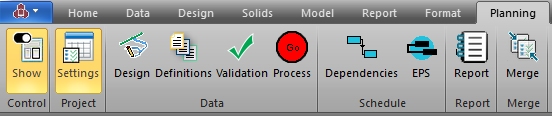 The Planning ribbon contains functions related to underground planning workflow, including project setup, design definitions and data management. It also includes commands to schedule and export scheduling data to Datamine's Datamine Task Scheduler application.