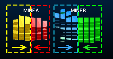 Consider an example where a project consists of two orebodies, A and B, and each level is divided into 3 sublevels. In both A and B mines, the direction of mining differs depending on the relative position of stopes to the access drives, e.g.: