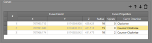The Curves table is where you add a curve profile and control its parameters, such as Radius, number of Spirals and Direction, but the Curve position is controlled interactively using the 3D view.