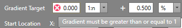 Gradient Target – The desired gradient to be achieved for the ramp design. The value can be related to any of the following units: [Percentage %], [Degrees ⁰] or [Ratio 1:n].