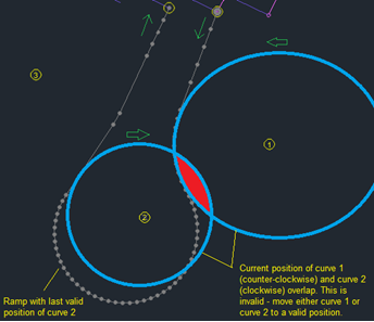 If there are invalid input parameters, or if a ramp path solution does not exist, then these values are displayed as Indeterminate. In this case, check that there are no invalid inputs on the Interactive Ramp Tool window, then, in Interactive Mode (which is only available if inputs are valid), verify that you do not have ramp curves too close to the start point, end point, or neighbouring curves of opposing directionality. (See example under compliance legend).
