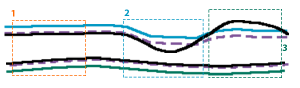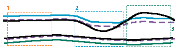 In area 1, it is possible to honour the minimum/maximum mining height, so the extruded solid aligns with the bounding surfaces. In area 2, the geological surfaces would cause the extruded volume to violate a minimum mining height, so in this case, the solid is formed above the hangingwall. In area 3, the opposite occurs; the extruded volume would violate a maximum height constraint, so is formed below the hangingwall.