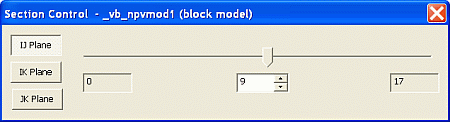 The Section Control dialog is used to define the orientation and position of the quick section, for the selected block model object, relative to the block model IJK axes.