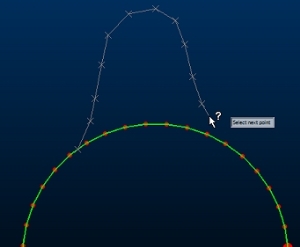 Subsequent left or right clicks determine new points to be inserted into the string, using the standard new-string behaviour (left-click to plane, right-click snapping). These points and the lines between them, and from the last point to the cursor, are shown as a preview.