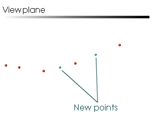 Inserting points in a 2D graphical environment (computer screen) when working in 3D space, requires the interpolation of a third dimension. The position of the point is calculated as a mean interpolation of neighbouring screen points, for example.