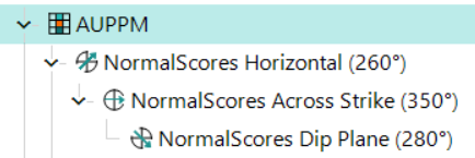 There are three levels of variogram fans that must be inserted below each other in the Project Tree. These are the horizontal fan, across-strike fan and dip-plane fan. For more information on selecting the maximum continuity direction, see Selecting the Direction of Maximum Continuity on Variogram Fans.